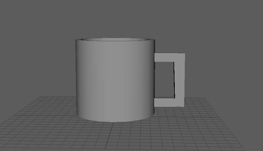 The handle in the image below is a cube primitive that has been manipulated and attached to the model of the mug through the use of the target weld tool. The cube was rescaled to a similar size to the mug and several faces were extruded and removed in order to create a hollow area in which a person would be able to hold the handle.
