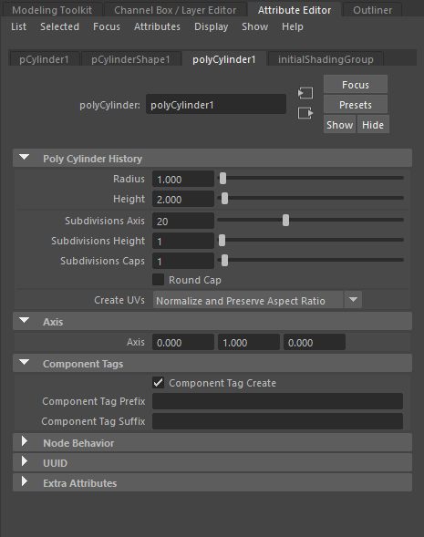 The top and the bottom faces of the cylinder, known as ‘caps’, are comprised of triangles. As the aim of this project was to make a mug, I needed to remove the top face of the cylinder to create a recessed space within the model. The top of the cylinder was removed by editing the value of the Subdivisions Caps within the attribute editor window. The value was changed from 1 to 0, which changed the way in which the caps were originally being formed into one large shape.