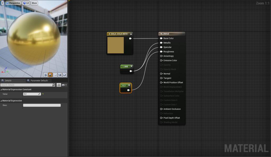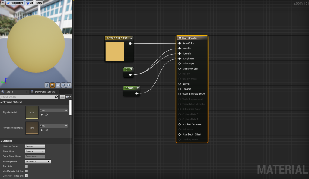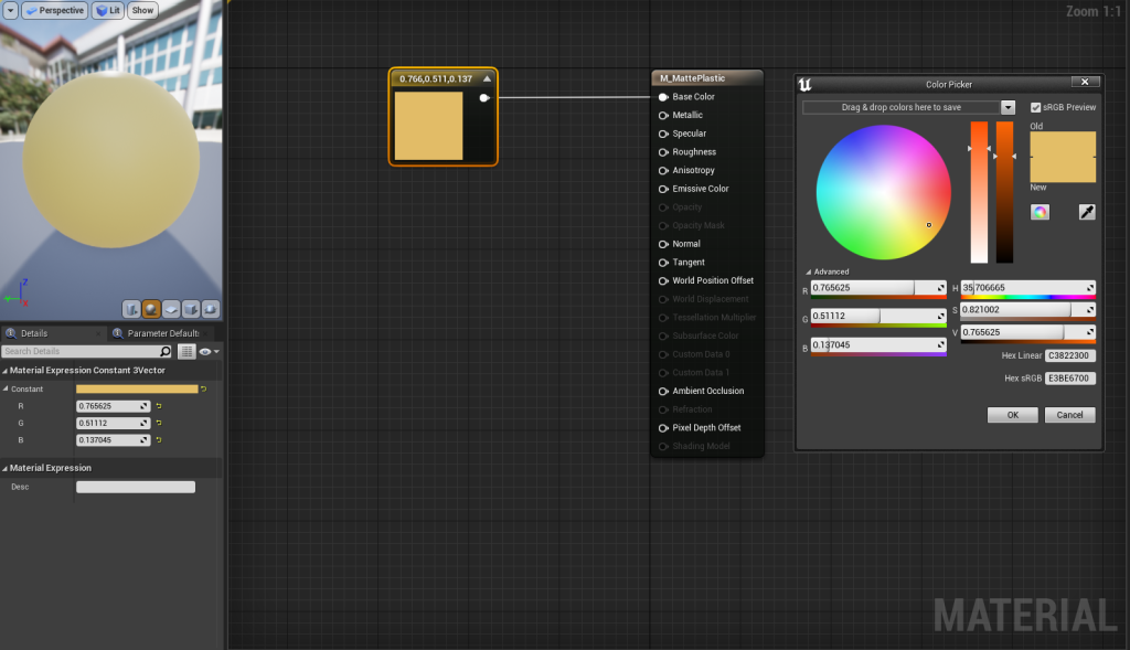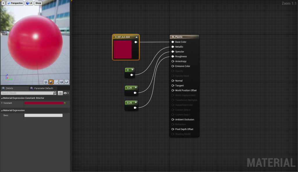 Unreal’s material editor allows for various elements to be edited. I started by creating a 3 Vector node and attaching it to the base colour, which allowed the base colouration of the material to be edited through the use of a colour wheel and RGB/HSV values. By adding other nodes into the editor, such as the Vector1 constants seen below in the screengrab of my Matte Plastic material, I could edit other aspects.