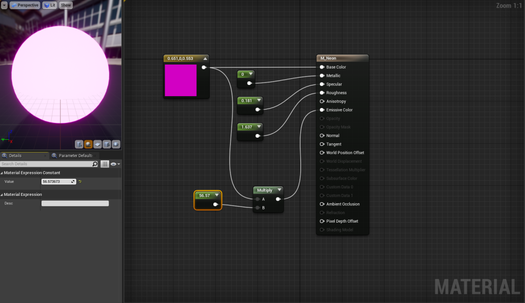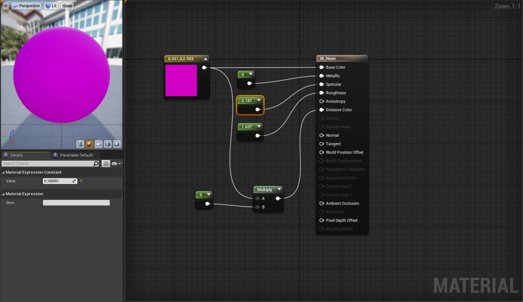 I created the Neon material by following the same steps as above but adding a multiplier to create a glow effect. Connecting the Vector 1 constant to the Multiplier along with the Vector 3 for the base colour allowed me to experiment with the intensity of the light emitted. In the images below, you can see the difference between having the value of the “Emmisive Colour” property set to 0 and then how the material behaves once the value has been increased; I had the value of the emissive colour set rather high to demonstrate creating the material and experimenting with Unreal, yet in future when I apply this material to a model I would have this value significantly lower due to all other properties becoming unnoticeable from the glow.