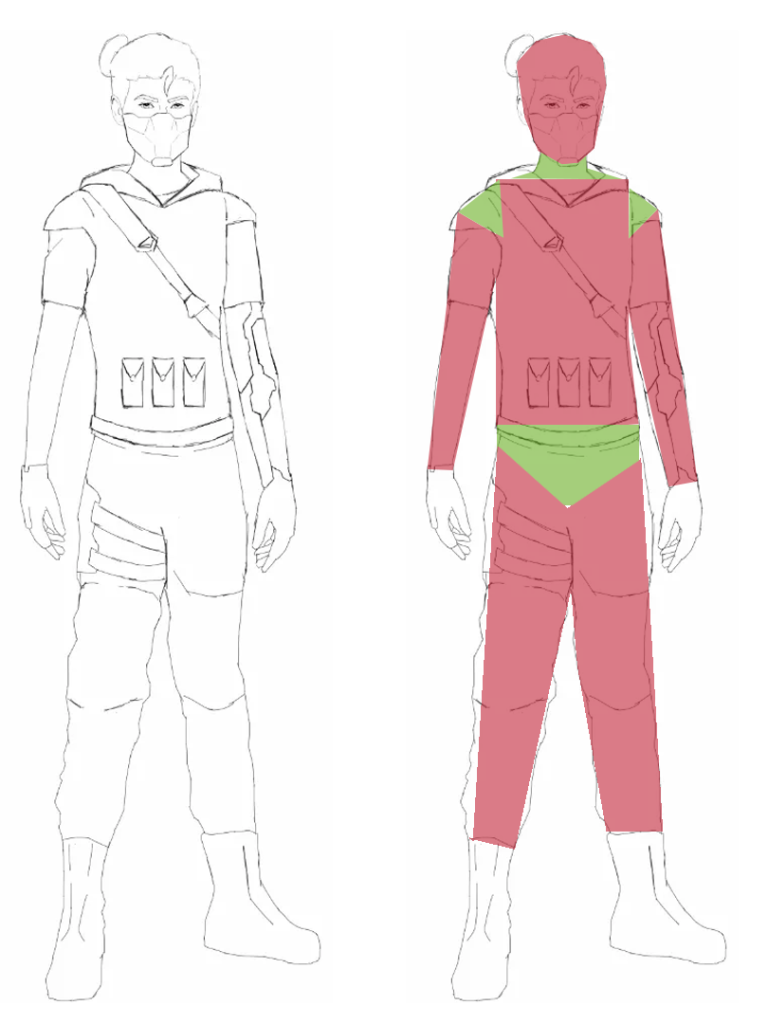 As an example, the base design that is seen on the left in the image below is composed of various shades of grey, with green and blue used to break the design’s pattern up. All of these colours are cooler, neutral tones that can help to create the impression that the wearer is cold and impersonal (Howard Bear, 2020), which would relate to the existing backstory and how the character is aiming to keep “Yasmine” and “Compton” as separate individuals. On the other hand, the bright colour palettes lend themselves to being almost abrasive and not caring about the dangers at hand, as these would actively draw attention to the wearer. The brighter designs would not allow for the character to be stealthy and blend in to the shadows as easily as some of the neutral palettes, but narratively would be interesting to explore, as if Compton knows that she isn’t blending in and doesn’t care due to her skill set and strength.