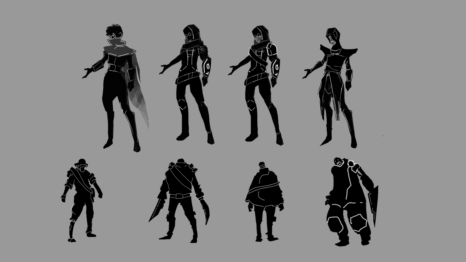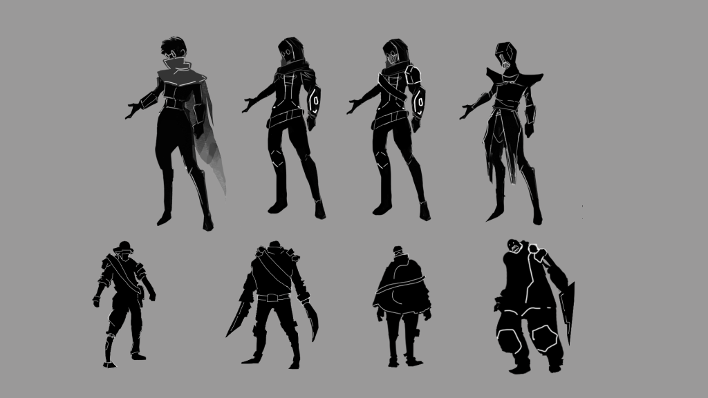 I decided to first experiment by creating some silhouettes to explore potential character designs. The top row of designs seen in the image below focused more on having a humanoid silhouette and adding additional elements, such as futuristic gauntlets, cloaks and belts that would help carry additional items to portray a mysterious character, which would fit within the cyberpunk genre. The bottom row of designs focused more on having a strong and dangerous silhouette that could easily convey to the player that this character is a danger.