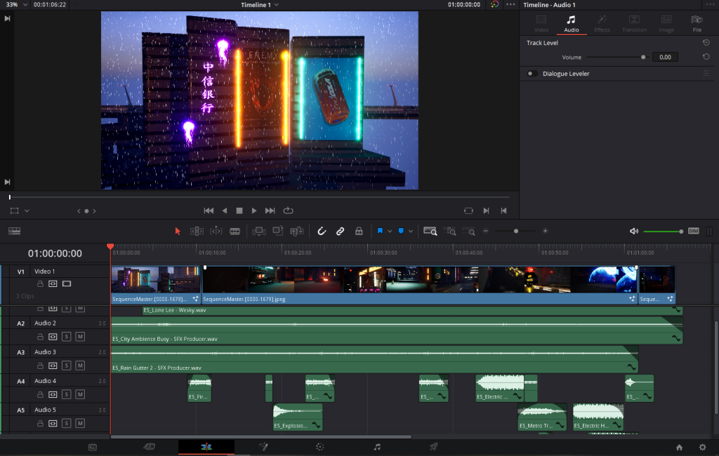 Having the ability to fade certain audio tracks, such as how the song Lone Lee by Wesky which plays throughout the sequence has a fade at the start of the clip helps to convey to the viewer that this city is loud and bustling but can have moments of quiet and peace as you move further away from the centre of it.