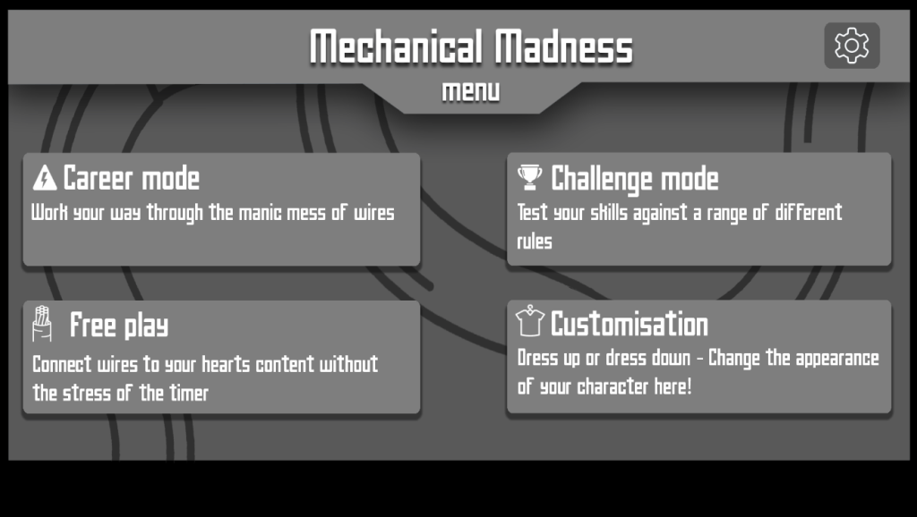 I created some UI concepts for Mechanical Madness to include in the game pitch assignment, showcasing potential screens that the player could see. Additionally, I made a mock-up of what the HUD would look like as the player navigates the space.