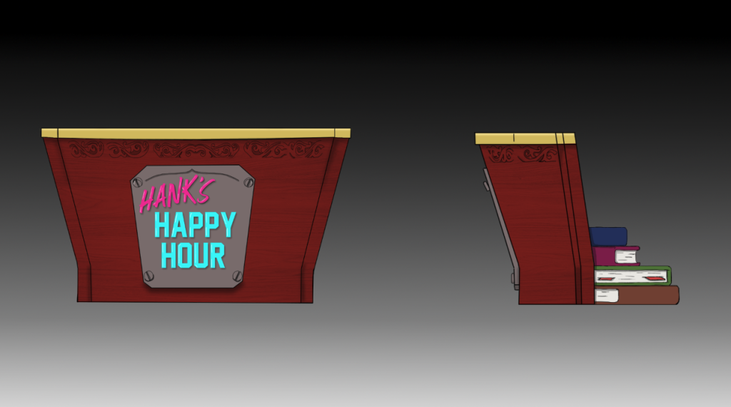 I started working on the shape of Hank the Presenter’s desk in Maya before exporting it as an FBX model to add detail within ZBrush.
