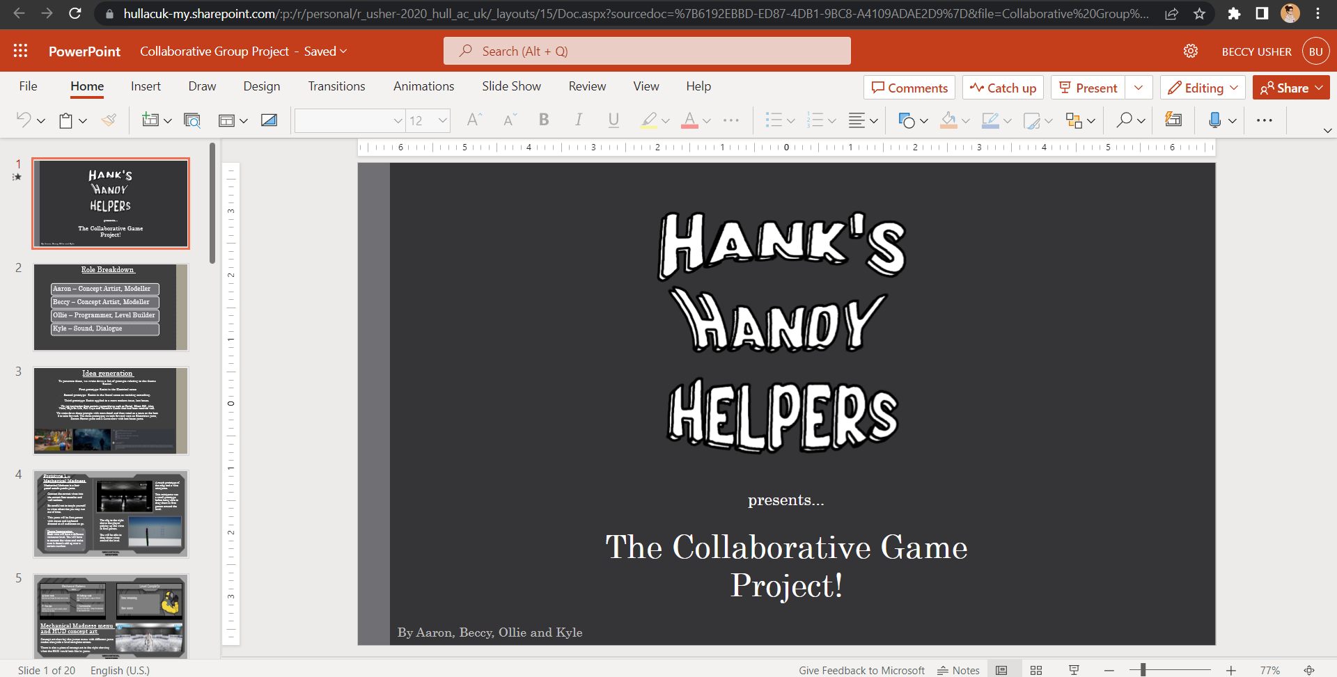 Aaron and I used the workshop time and the time between the sessions to work on creating a block out for Hidden Horror while Ollie worked on the mechanics. The file was zipped and uploaded to OneDrive to allow for additional elements to be added from home. I also shared a PowerPoint file into our Discord group to allow for some of the slides to have information added; As the PowerPoint was uploaded to SharePoint, we could all work on it at the same time rather than one person making individual changes.